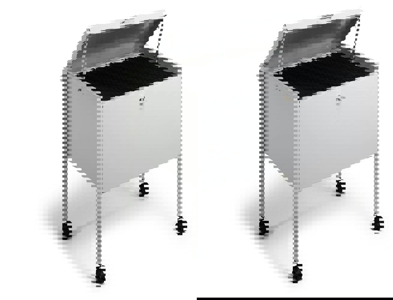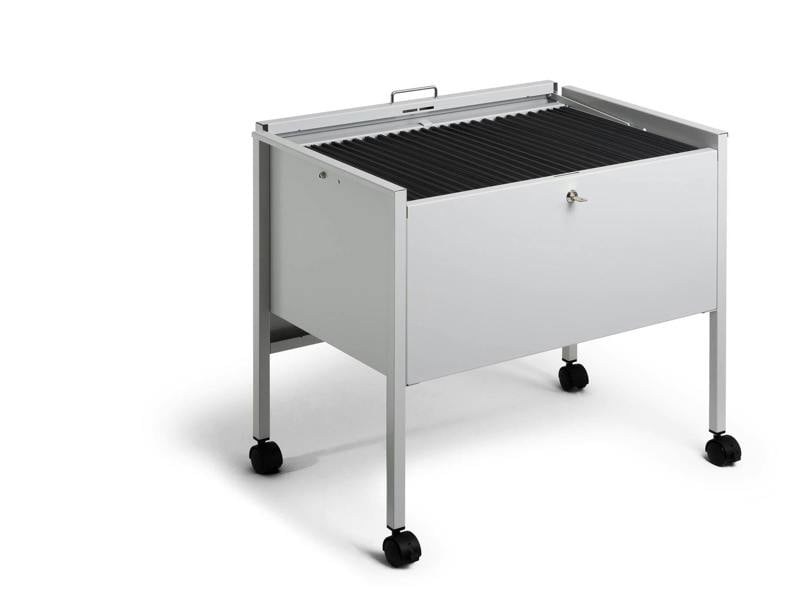 Introducing Durable’s suspension file trolley ECO designed for security and efficiency. With a lockable GDPR compliant lid, it's made of durable, scratch-resistant epoxy polyester coated steel. Equipped with four castors, including two with brakes, it offers smooth and stable manoeuvrability for effortless file transportation in any workspace.