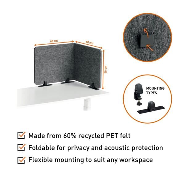 Flexible and adaptable, the panel’s infinitely adjustable angles let you create the perfect setup for your needs. Its easy-to-mount system includes desk clamps, table bases and can also be freestanding at 90 degrees, making it an ideal choice for any professional setting. Available in two sizes, 120cm and 160cm, both maintain a 50cm privacy screen height.