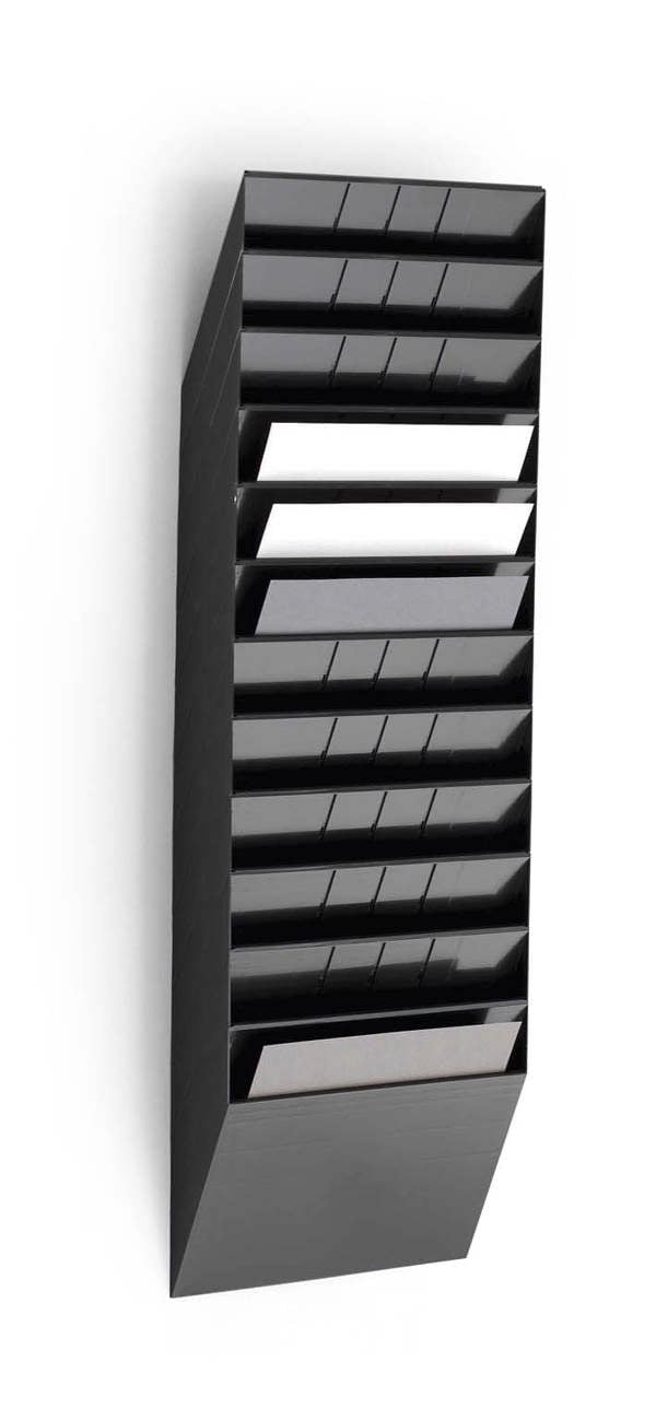 Keep A4 landscape documents neatly displayed and accessible with the Durable FLEXIBOXX Wall Mounted Literature Tray in black. Featuring 12 modular trays, this unit is perfect for storing brochures, leaflets and files in landscape orientation for quick access and professional presentation.