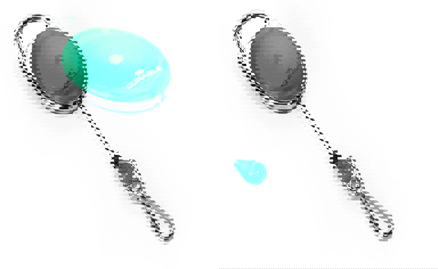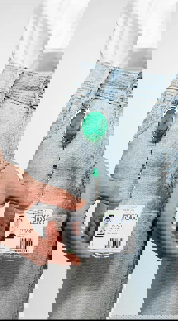 Modern translucent badge reels with key ring clip compatible with keychains and punched hole name badges. The reel features a secure carabiner for attaching to pockets or belts. Perfect for workplaces with high levels of security.