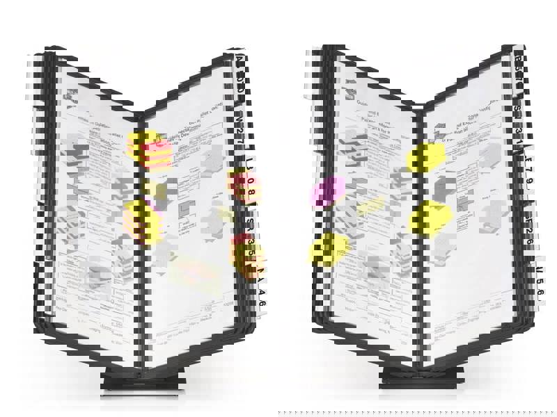 The DURABLE VARIO® range is a robust and economical display panel system with a sturdy metal base. Ideal for use in industrial areas and offices. This desk unit includes 10 A4 display panels and tabs. The panels are anti-glare and copy-proof which makes it easy to use. Great for holding health and safety instructions, machine manuals, etc.