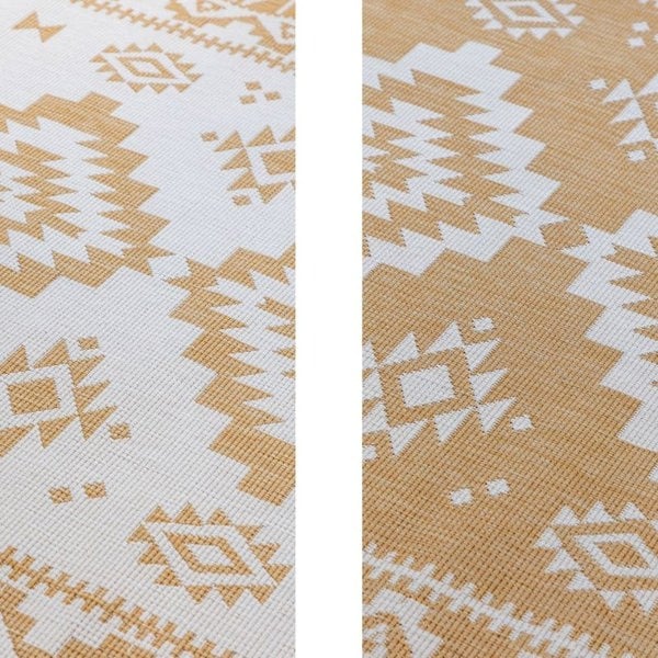 Add cheerful style and practical versatility to your home or outdoor spaces with the Dynamic Reversible Yellow Rug. Its bright oriental-inspired pattern in yellow brings warmth and personality to patios, balconies, hallways, or living areas.