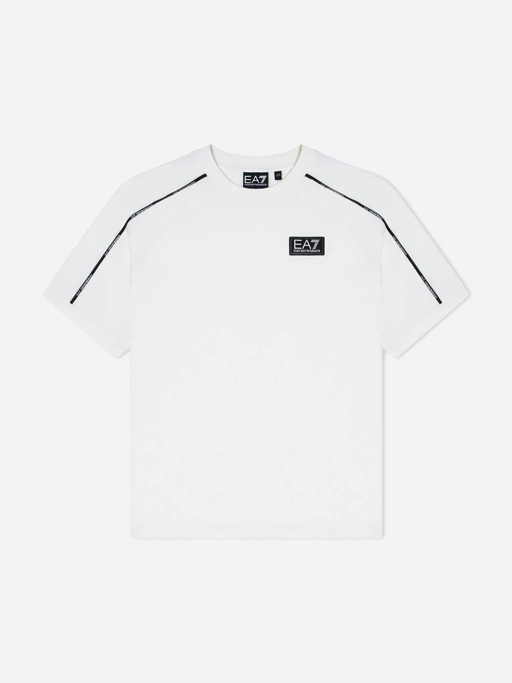 EA7 Emporio Armani Boys Train Logo Tape T-Shirt in ivory forms part of the SS2026 collection. The design includes EA7 logo tape detailing for a clear branded finish. The ivory colourway keeps the look clean and simple.