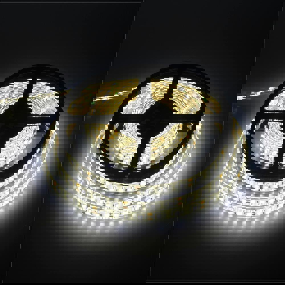 The impressive Plug and Play IP65 rated LED tape light with 60 LEDs per metre. Covered in epoxy resin to protect the LEDs the depth is just 2. 8mm and at 10mm wide the tape will fit easily into many locations. Supplied on a 5 metre reel with a 3M self-adhesive back, this tape is easily applied to most smooth surfaces by simply removing the backing paper. The tape can be easily cut or joined, with cutting points at every 3rd LED (5cm) intervals. Highly flexible and versatile and with a low power consumption the tape is ideal for many uses such as decorative lighting in homes, vehicles, shops, bars, nightclubs and as the tape itself (only) is waterproof it is ideal for use in kitchens and covered outdoor applications. Included in the kit is a (2250mA 12V) In-Line Power Supply.