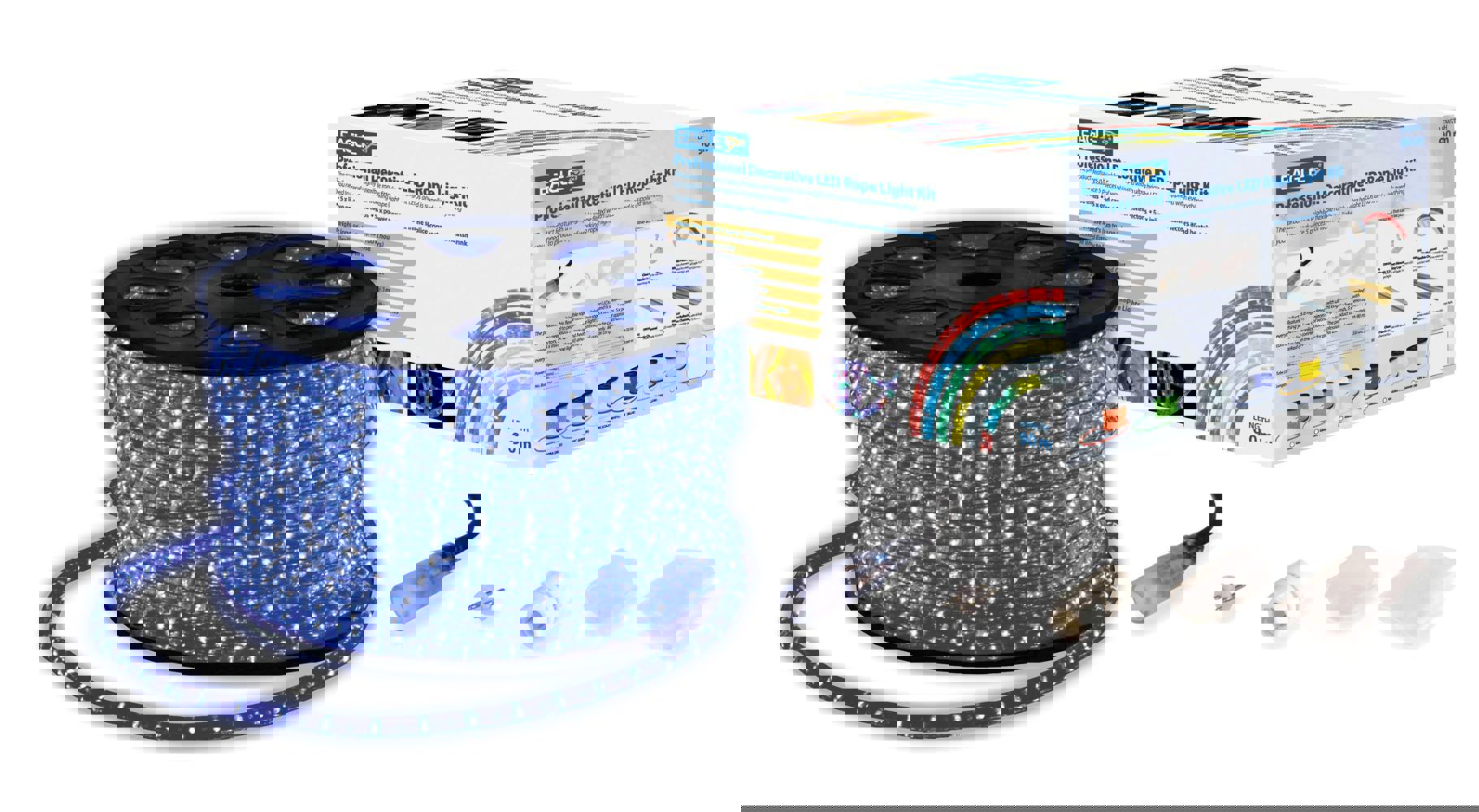 A highly flexible and robust drative rope lighting product supplied with a set of comprehensive wiring accessories allowing up to 5 separate rope lights to be assembled. The product features ultra bright LEDs producing intense vibrant colours, highly flexible tube allowing complex designs and shapes to be formed, simple and quick to make up and install with a large operational temperature range of between -20C to + 60C. The product is supplied with 10 x 2m live ends, 10 x end caps, 10 x power connectors, 10 x inline splice connectors, heat shrink and glue. The product can be cut approximately every 1m (marked on the rope light) and is for professional use only.