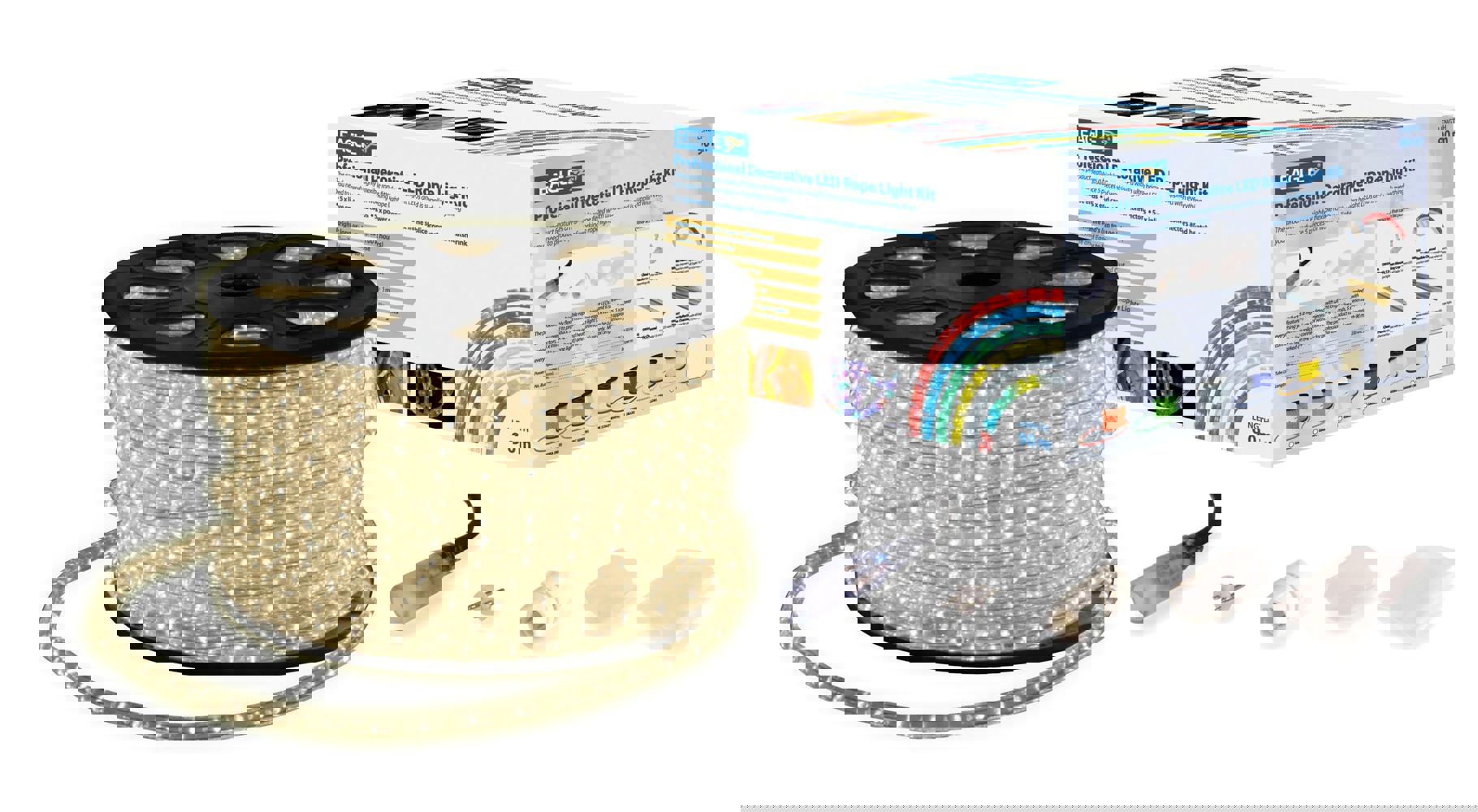 A highly flexible and robust drative rope lighting product supplied with a set of comprehensive wiring accessories allowing up to 5 separate rope lights to be assembled. The product features ultra bright LEDs producing intense vibrant colours, highly flexible tube allowing complex designs and shapes to be formed, simple and quick to make up and install with a large operational temperature range of between -20C to + 60C. The product is supplied with 10 x 2m live ends, 10 x end caps, 10 x power connectors, 10 x inline splice connectors, heat shrink and glue. The product can be cut approximately every 1m (marked on the rope light) and is for professional use only.