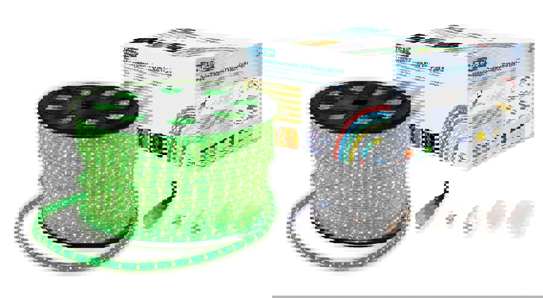 A highly flexible and robust drative rope lighting product supplied with a set of comprehensive wiring accessories allowing up to 10 separate rope lights to be assembled. The product features ultra bright LEDs producing intense vibrant colours, highly flexible tube allowing complex designs and shapes, simple and quick to make up and install with a large operational temperature range of between -20C to + 60C. The product is supplied with 10 x 2m live ends, 10 x end caps, 10 x power connectors, 10 x inline splice connectors, heat shrink and glue. The product can be cut approximately every 1m (marked on the rope light) and is for professional use only.