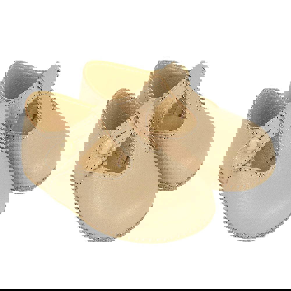 Camel, soft Italian leather pre-walker baby shoes with a flexible sole and a comfortable lightly padded insole. This heritage style is a traditional, English pram shoe with a t-bar and little button fastening. The sole is made from synthetic suede leather and is very hard wearing. .