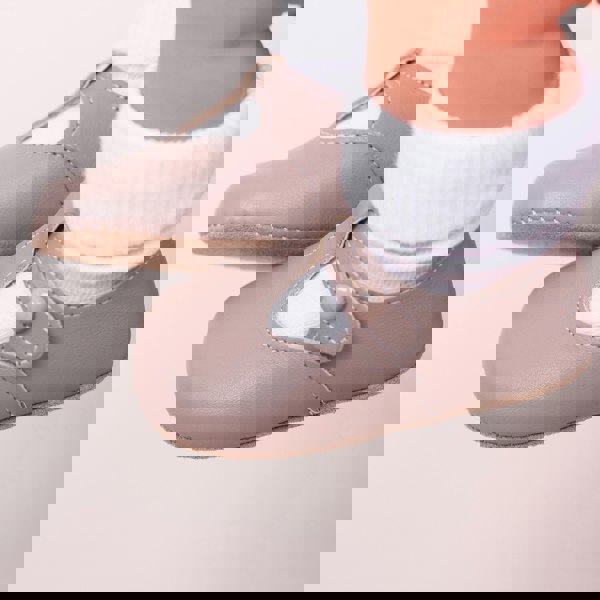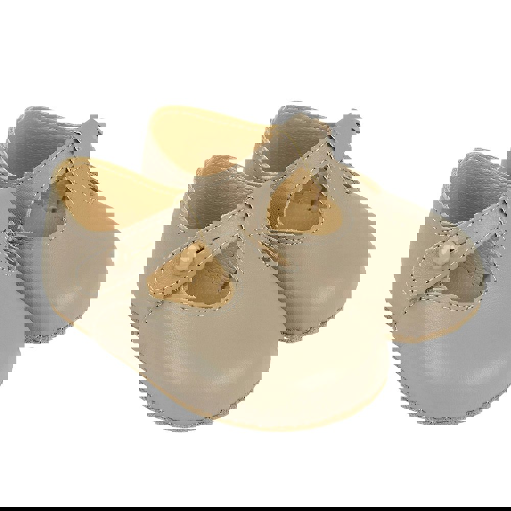 Taupe, soft Italian leather pre-walker baby shoes with a flexible sole and a comfortable lightly padded insole. This heritage style is a traditional, English pram shoe with a t-bar and little button fastening. The sole is made from synthetic suede leather and is very hard wearing. .