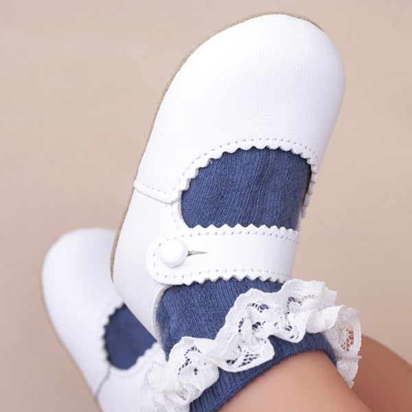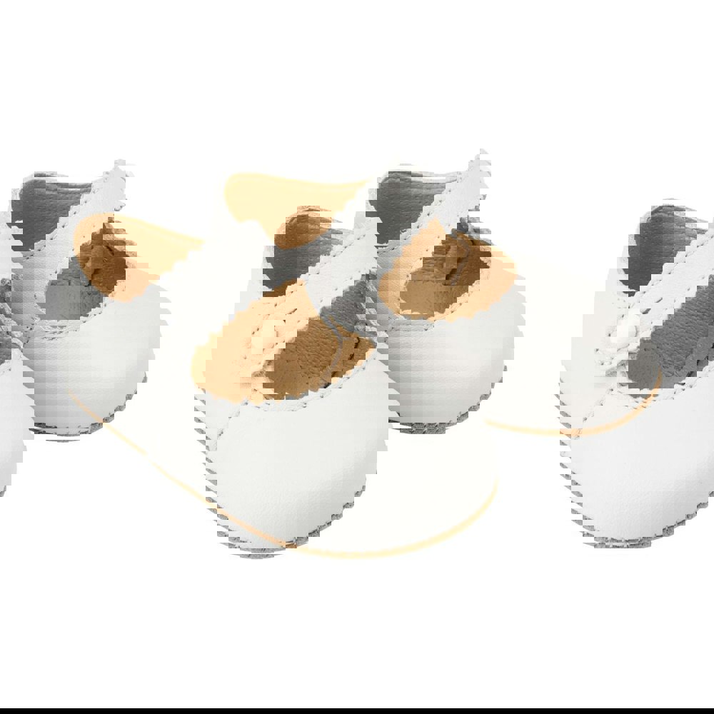 Stunning white soft leather baby girl shoes, in a traditional, 'Mary Jane' style, they have a bar strap with a little button fastening and a pretty scalloped edge. The unstructured sole is made from soft yet durable synthetic suede, ideal for indoor use. .