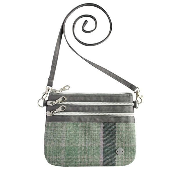 A compact tartan tweed crossbody designed for minimal daily carry.