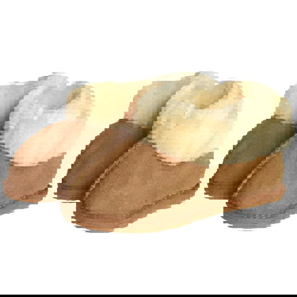 These children’s slipper boots combine suede uppers with a sheepskin lining for a warm, cosy feel. Finished in a chestnut colour, they offer a classic boot shape suited to indoor wear during colder weather.