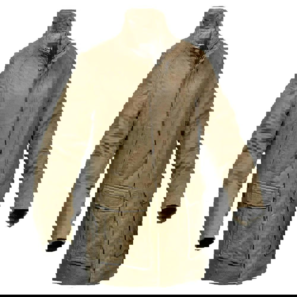 This men’s mid length jacket from Eastern Counties Leather is made from sheep leather with a soft touch fabric finish. It comes in khaki with a plain, vintage look and a snuffed finish for a distinctive surface texture.