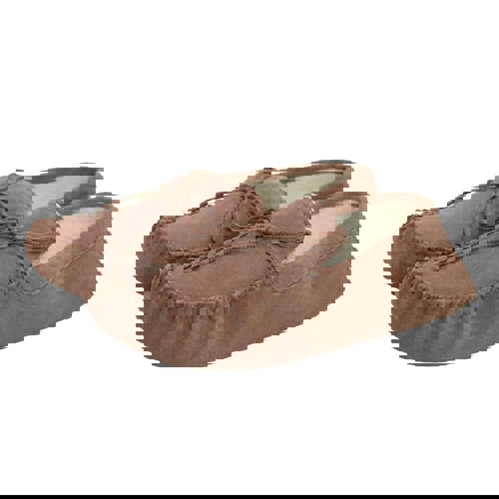 These unisex adult moccasins from Eastern Counties Leather are made with a suede upper and a sheepskin lining. Finished in camel, they combine a low-cut profile with stitched detailing and a round toe shape.