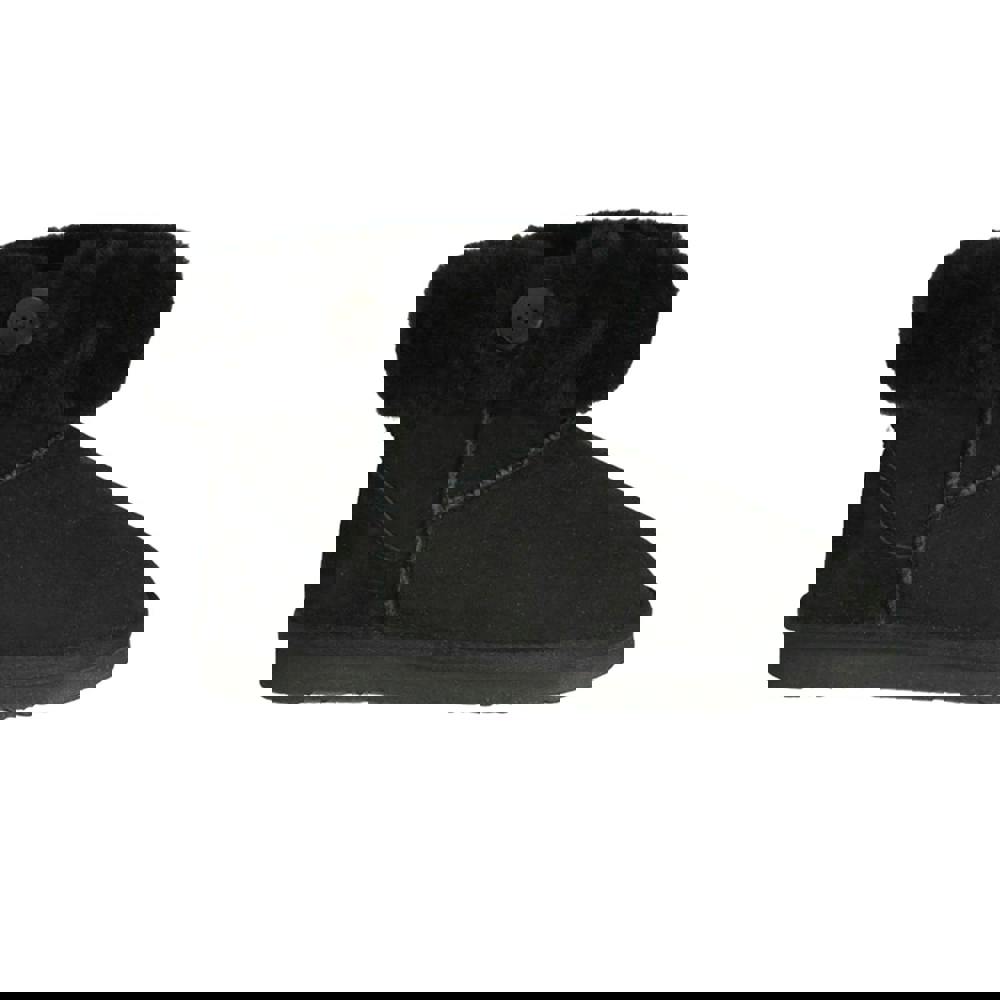 These double face sheepskin boots combine a clean black finish with a stitched cuff detail and button fastening. A reinforced suede heel adds structure, finished with Royal Ram logo embossing. An EVA sole completes the design.