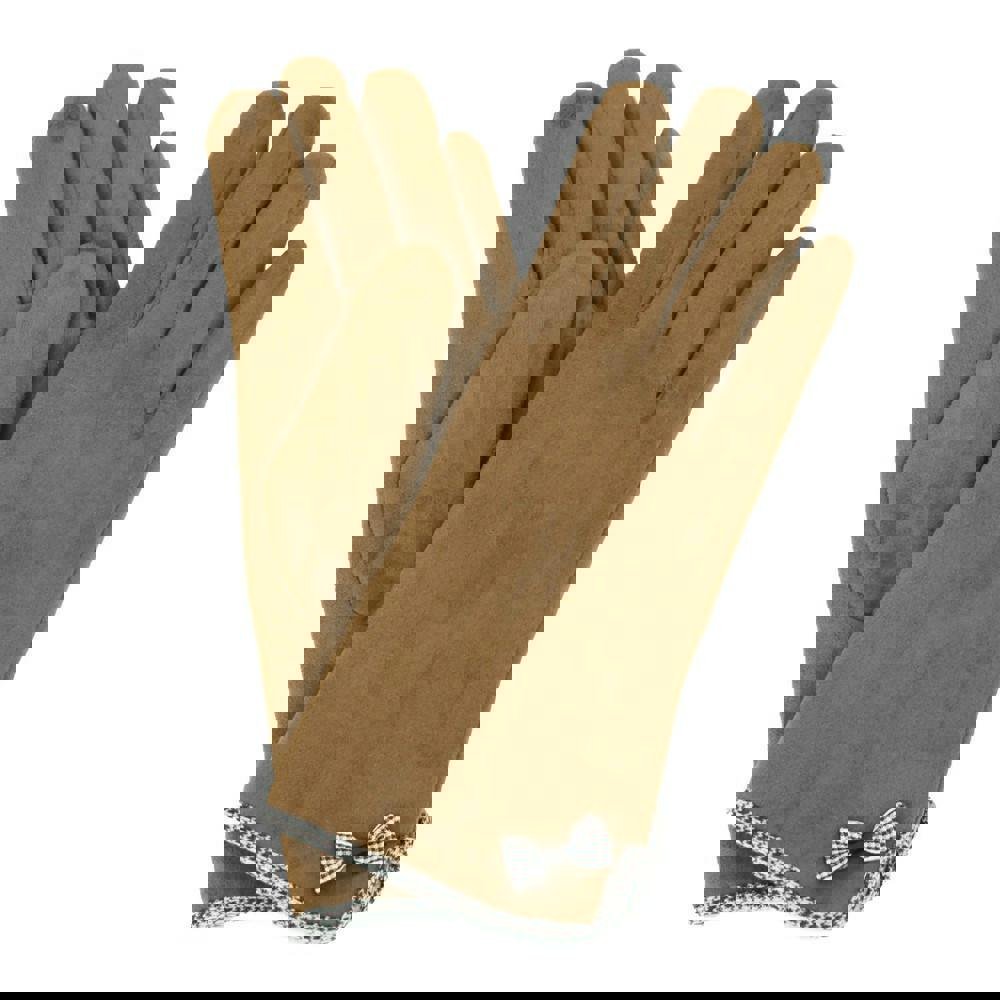 Finished with gingham detailing at the bow and cuff, these gloves add subtle pattern and interest without feeling overstated. A warm faux fur lining helps keep hands comfortable in lower temperatures, while touch screen embroidery on the index finger allows you to use compatible devices without removing your gloves.
