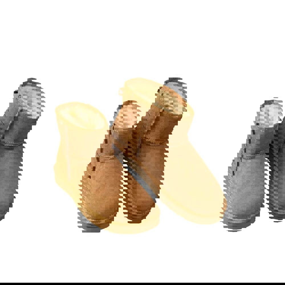These women’s Jade boots from Eastern Counties Leather are made with a sheepskin upper and finished in a plain chestnut colourway. Cut to an ankle height, they slip on for straightforward wear and sit on a flat sole. A round toe completes the clean, simple profile, while reinforced suede heels add a considered detail.