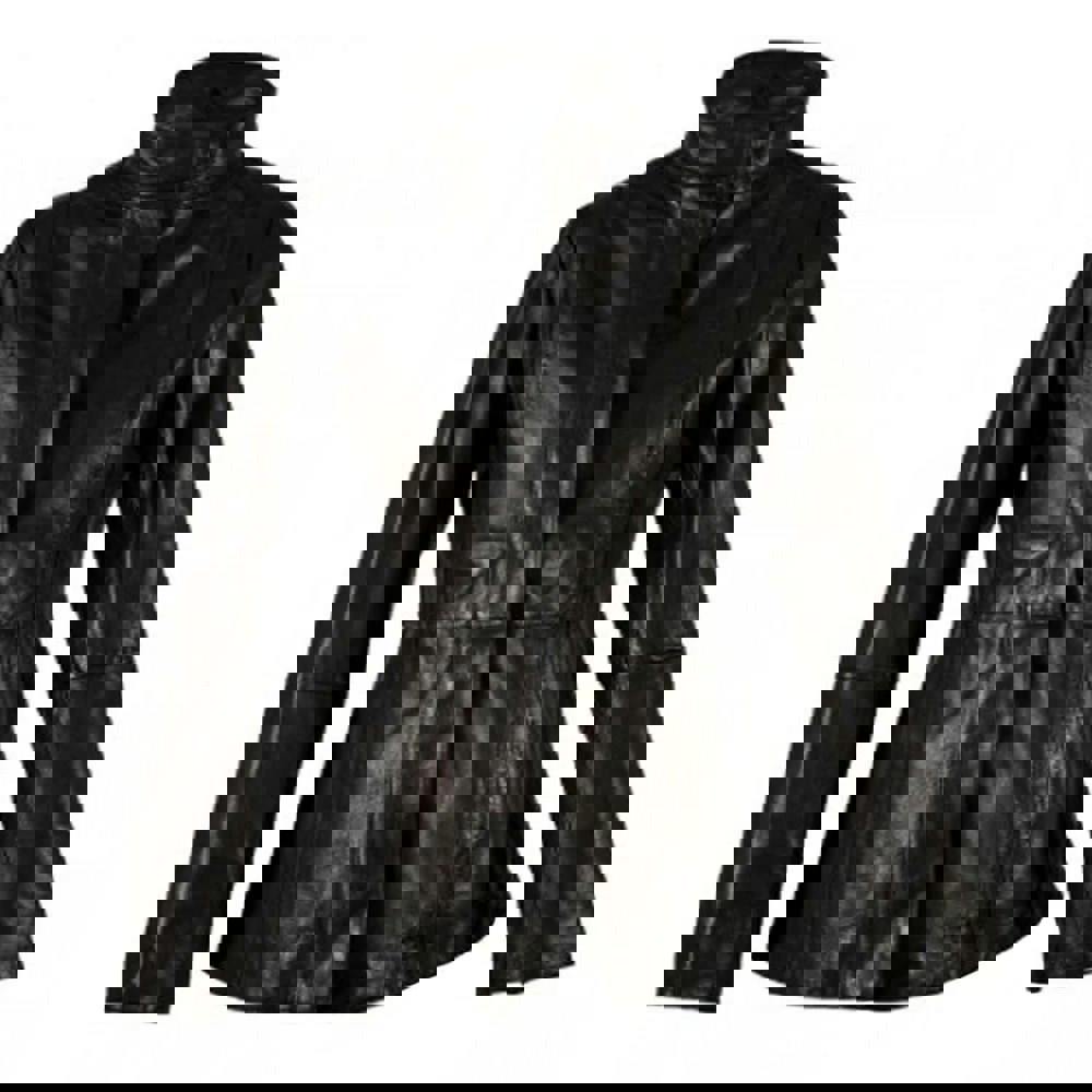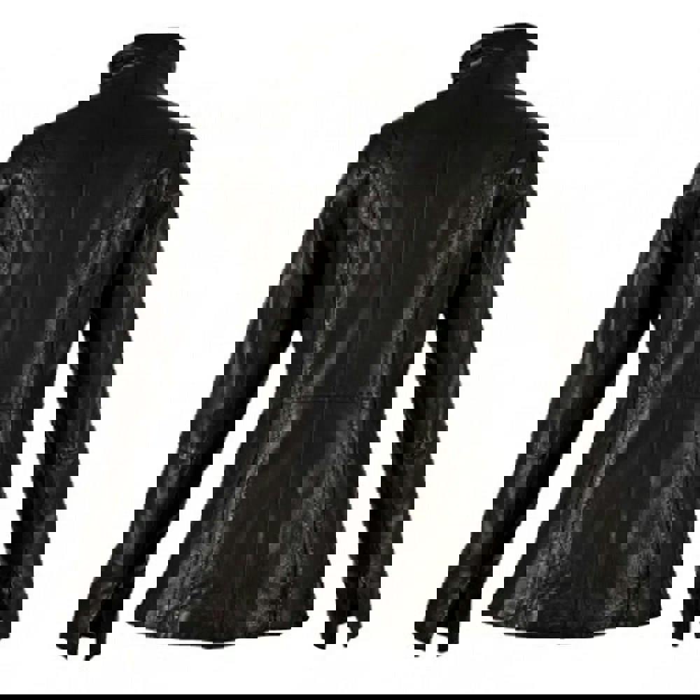 This women’s leather jacket comes in black with a plain finish for a clean, understated look. It has long sleeves and a standing collar, creating a structured silhouette that works well for everyday outerwear and layering.