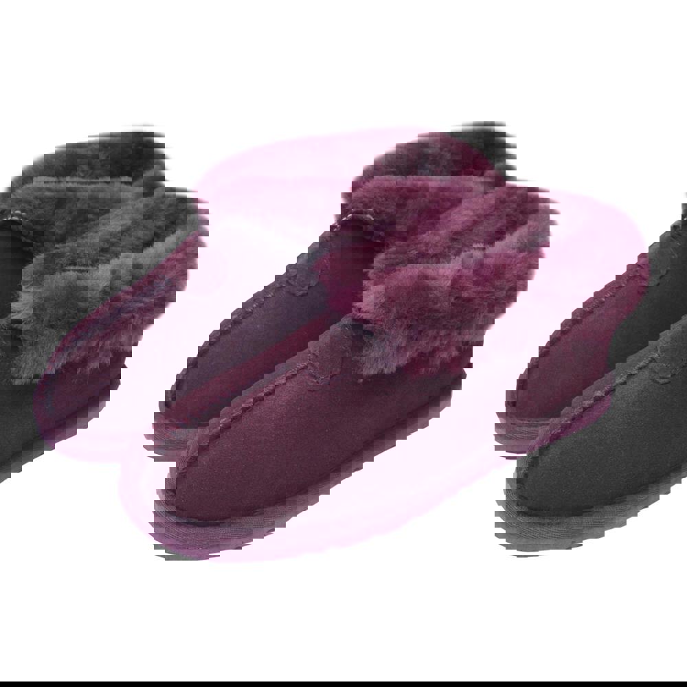 Finished in plum, this pair offers a boot-style slipper profile with a fully lined interior. The simple design focuses on comfort-led materials and a supportive sole, making them a straightforward option for colder days.