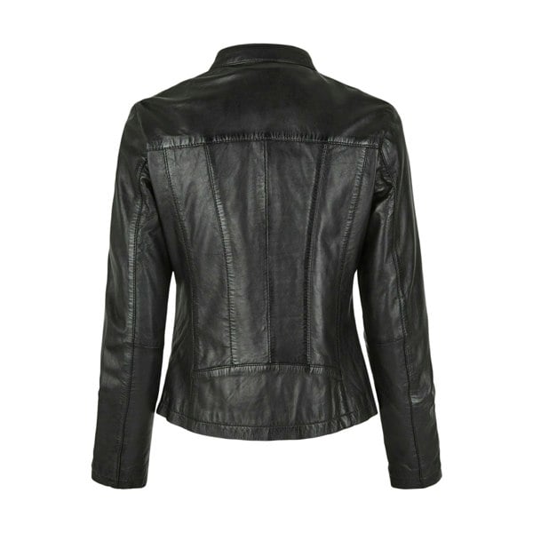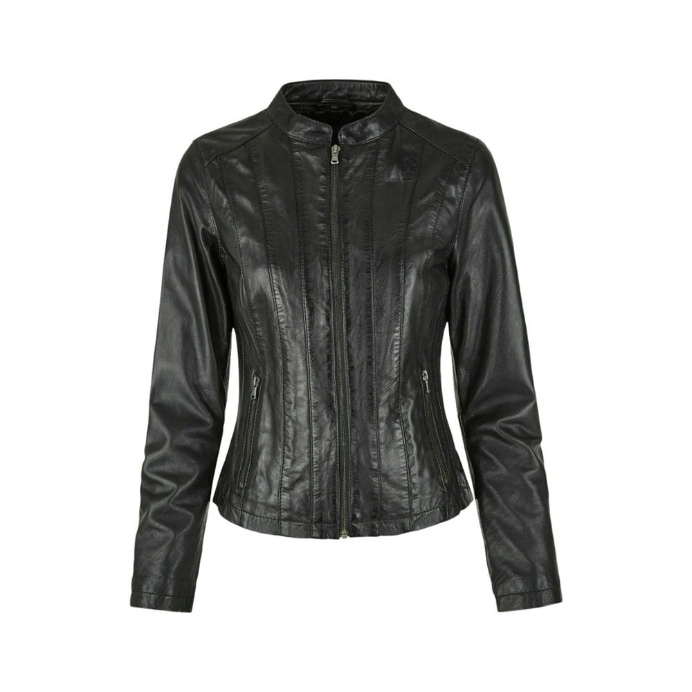 Crafted from sheepskin, this women’s jacket is finished in black with a plain, vintage look. Detail seams and a wrinkled effect add texture to the outer, while the standing collar keeps the neckline clean and structured. Long sleeves complete the silhouette, making it a practical layer for everyday wear.