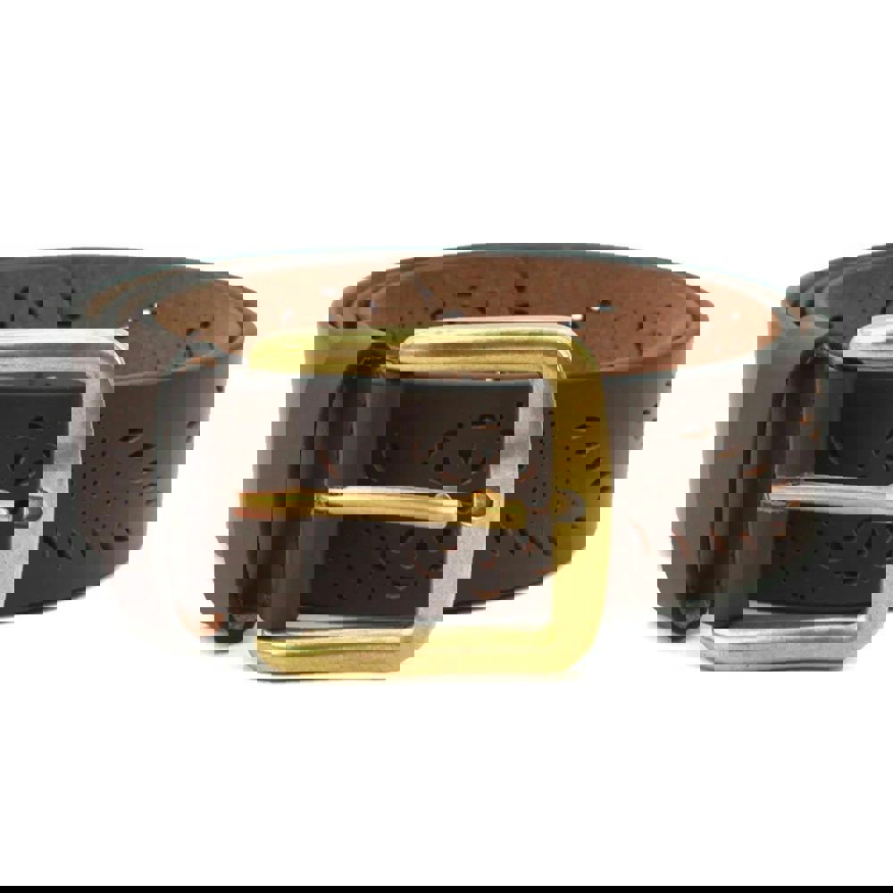 Finished in brown, this waist belt features laser cut holes for a distinctive, detailed appearance. A buckle fastening provides a secure fit, while the notched finish adds a subtle design touch. Brass elements complete the look with a smart, polished contrast.