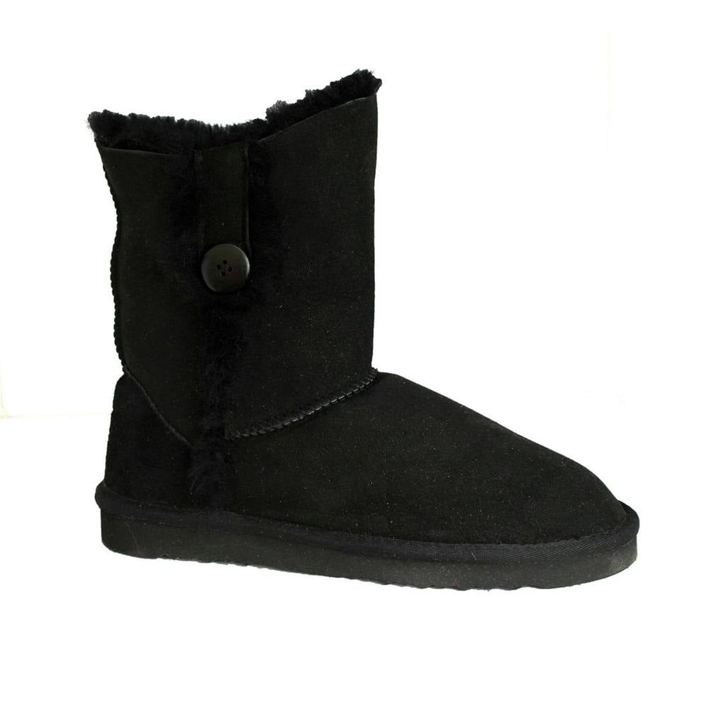 These short outdoor boots are made from real sheepskin and finished in black. A button detail adds a distinctive touch, while the reinforced suede heel provides added structure.