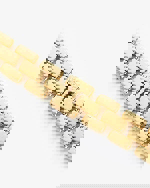 Our New Chain Chapter 15K Gold Chunky Triple Chain Link Bracelet is made entirely of 316L stainless steel and then covered with a durable coat of gold using PVD, for a waterproof and high-strength finish. Featuring signature links through the centre, sandwiched between engraved inner and smooth outer links. Measuring approximately 21. 5cm in chain length, with a sliding clasp so you can adjust this to make it tighter, if you wish and a chain width of approximately 12mm.