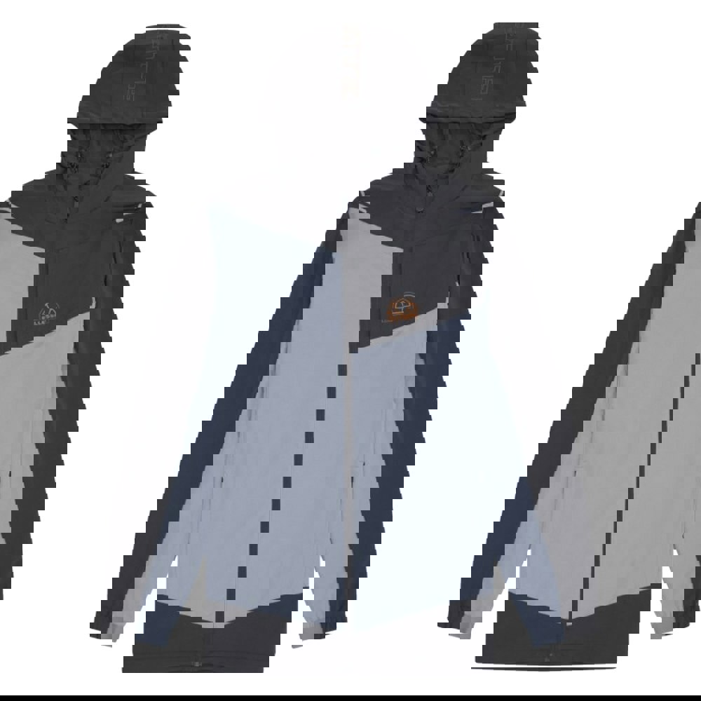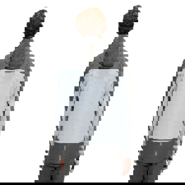 This long-sleeved style fastens with a full zip and includes a branded zip pull. A hooded neckline with rib knit and taped detailing is finished with a drawstring, while knit rib trims at the cuffs and hem add a clean, structured edge. Two side pockets complete the design.
