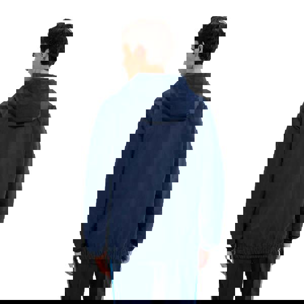 This overhead hooded jacket is made from 100% polyester with a mesh lining. It comes in navy with a plain finish and an Ellesse logo detail. A durable water repellent finish and heat transfer technology are specified for the fabric.