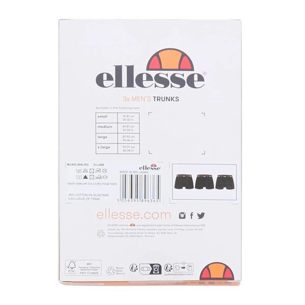 Ellesse Muxel884 boxer shorts come in a pack of three in black. Made from 95% cotton and 5% elastane, they combine a plain base with bold stripe detailing and logo branding. The waistband is elasticated and finished with branded detailing for a clean, recognisable look suited to everyday wear.