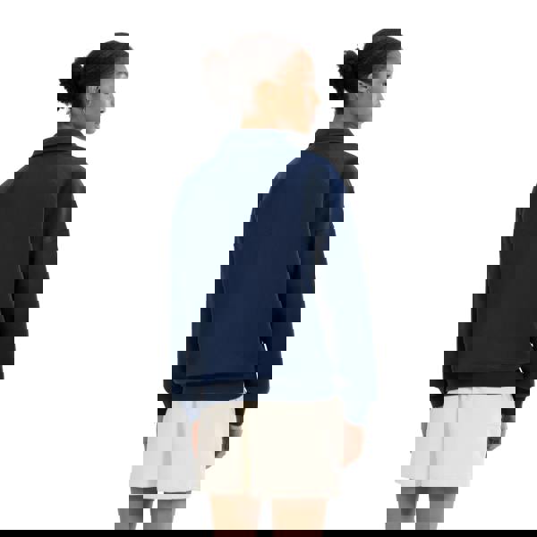 Finished in navy, it has an embroidered logo design, a turn down collar and long sleeves with a drop shoulder shape. The pull over fastening keeps the look clean and simple.