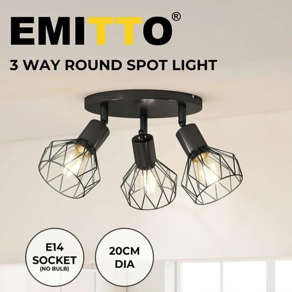 The EMITTO 3-Way Spotlight Ceiling Light combines vintage metal styling with fully adjustable lamp heads to deliver targeted flexible lighting for kitchens hallways bedrooms living rooms and more. Made from durable iron with a black powder-coated finish it is rust-resistant and designed for long-term use.