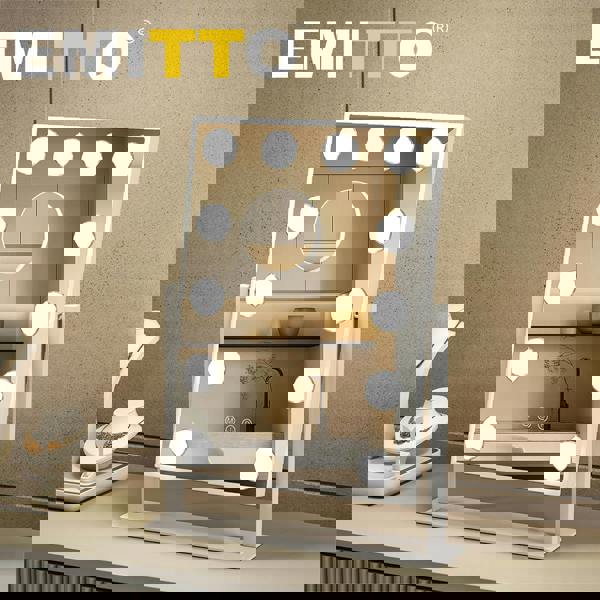 Upgrade your beauty routine with this LED makeup mirror featuring 12 bright bulbs and a sleek rectangular design (31x47cm). This lighted vanity mirror offers 3 adjustable colour temperatures—warm daylight and cool—so you can apply makeup with perfect lighting. With touch control a durable metal base and 360° rotation it's ideal for your dressing table or vanity desk. Includes a 10X magnifying mirror with suction mount for close-up detail. No installation needed—use it as a desktop mirror or wall-mount it with included hardware. Powered by plug-in adapter. Long-lasting 50 000h LED bulbs.