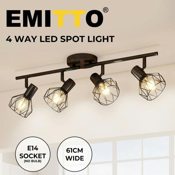 The EMITTO 4-Way Spotlight Ceiling Light features a vintage black metal design with fully adjustable lamp heads for flexible and focused illumination. Its sturdy iron construction with powder-coated finish ensures durability rust resistance and long-term performance. Ideal for kitchens hallways bedrooms living rooms and more.