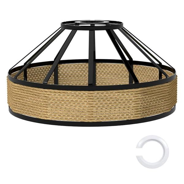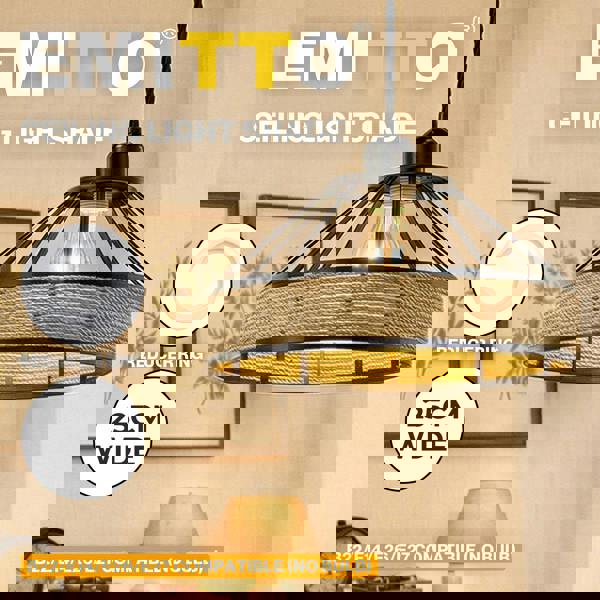 Enhance your interior with the Emitto modern industrial ceiling pendant light shade featuring a durable black iron frame wrapped in natural hemp rope. The open cage structure combined with rustic rope detailing creates a warm ambient glow ideal for industrial farmhouse vintage and modern interiors.