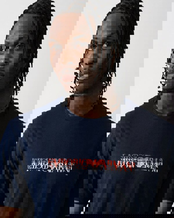 Discover designer men's short sleeve t-shirts & tops with Emporio Armani's Men's Large Logo Beach T-Shirt in Armani Blue Pr. Macrologo