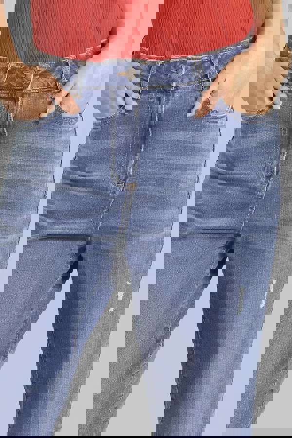 The Blue Straight Fit High Rise Ripped Jeans are a stylish and trendy addition to any wardrobe. These jeans feature a straight fit, which means they have a slimming and elongating effect, hugging your body from the hips to the thighs, and then relaxing slightly towards the ankles. The high-rise design provides a flattering fit that accentuates your waistline and sits comfortably above your hip bone.