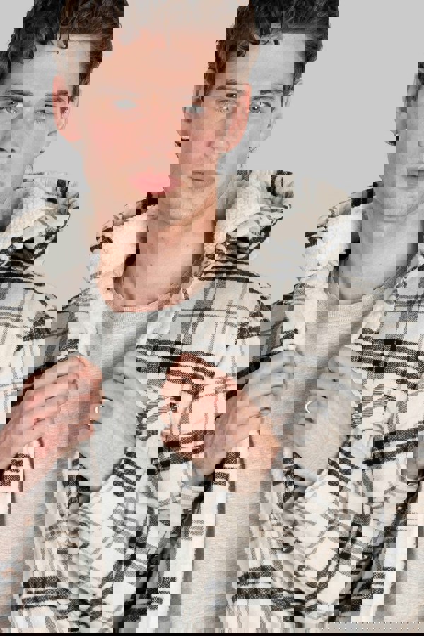 Men's Ecru Check Hooded Borg Lined Shacket, the perfect fusion of style and warmth for the colder months. This shacket is designed to keep you cozy and comfortable, with a sherpa lining that insulates against the chill. The bonus of a fixed hood ensures extra protection against the elements, providing a snug fit that will keep your head and ears warm.