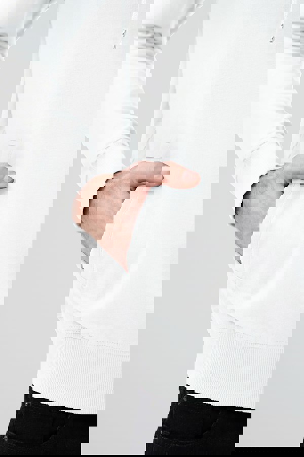 The long sleeves on this hoodie are complete with ribbed cuffs, providing a snug fit that keeps the cold out. The hem of the hoodie is also ribbed, adding to the overall comfort and fit.