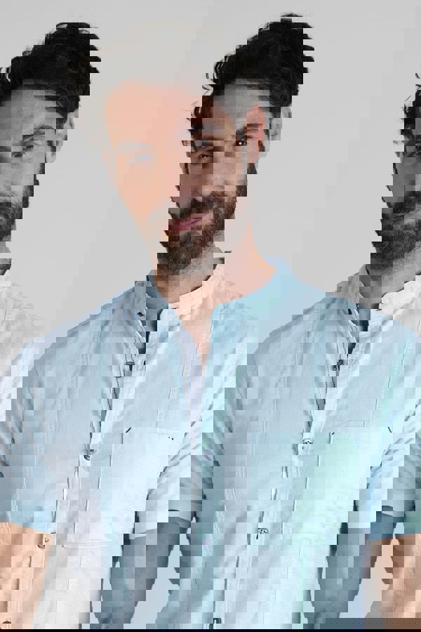 The modern grandad collar on this shirt is a contemporary take on a classic style, adding a touch of refinement to any outfit. The button-down front and short sleeves make it versatile for warmer days, while the functional chest pocket provides practicality and convenience.