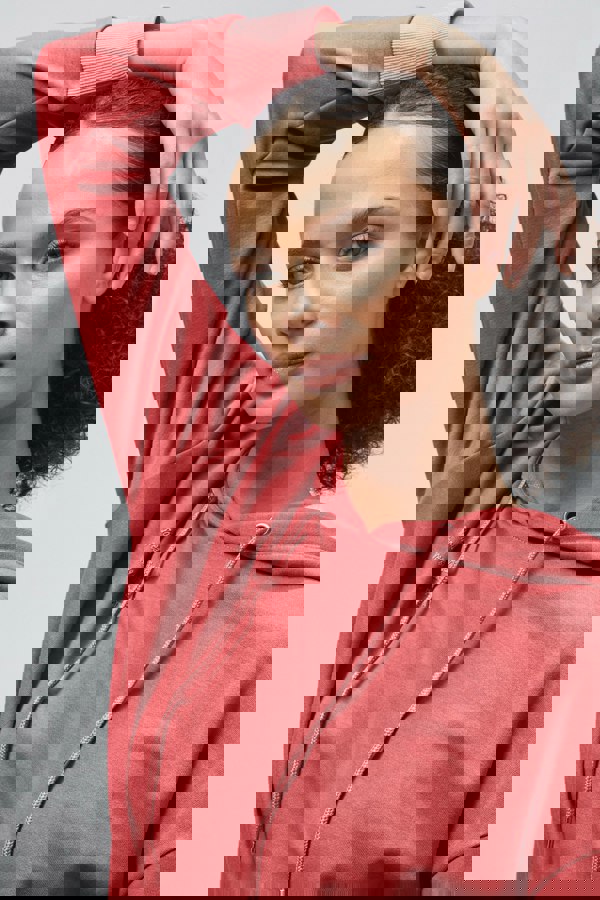 Moving towards the hood, the drawstring comes with a metal stopper and eyelets for easy adjustment. The hood itself is loose-fitting, allowing for a comfortable and relaxed look. The metal stopper ensures that the drawstring stays in place, preventing the hood from slipping off.