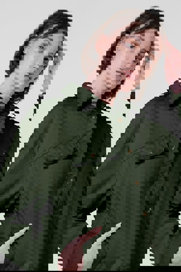 The Women's Green Flap Pocket Button Detail Jacket boasts a cropped silhouette, expertly designed to flatter your figure by accentuating the waistline and drawing attention to your midsection. The jacket hits just above the hip, making it a perfect layering option for pairing with jeans, leggings, or skirts.