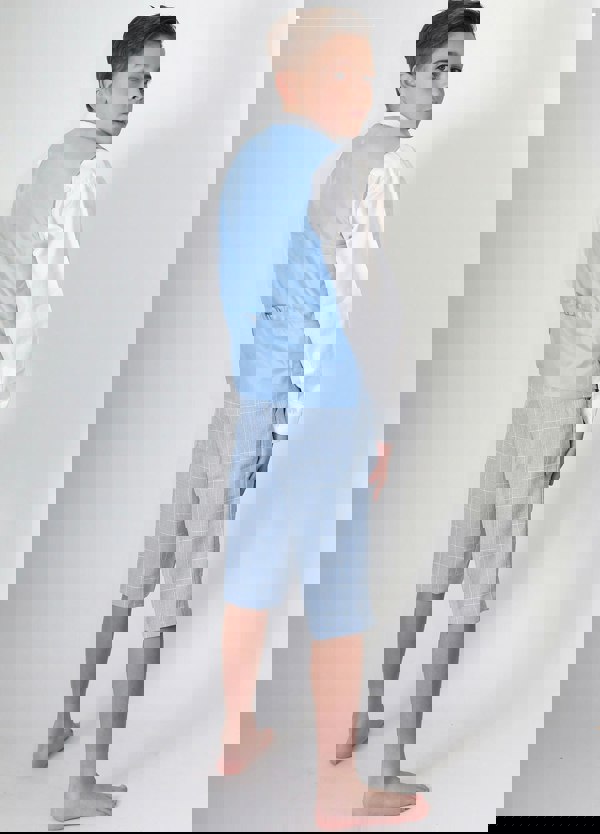 This lightweight sky blue check 4 piece linen look suit features blue and white check waistcoat, blue check elastic shorts, long sleeve white shirt and matching bow tie.