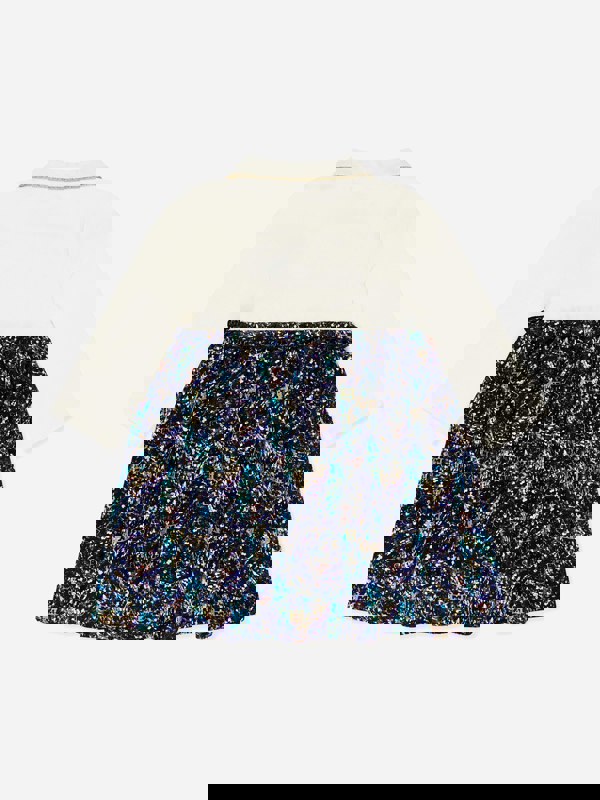Escada brings a refined, glamorous aesthetic to this girls’ navy bi-material dress. The design combines a long-sleeved top with a printed geometric skirt, creating a bold contrast in colour and pattern. A Peter Pan collar adds a classic finish, while three gold embellished buttons provide a polished detail at the front.
