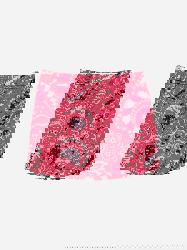 Etro boys swim shorts with a floral paisley print in pink. Made in Italy, this pair brings a distinctive pattern to holiday wardrobes and poolside days.