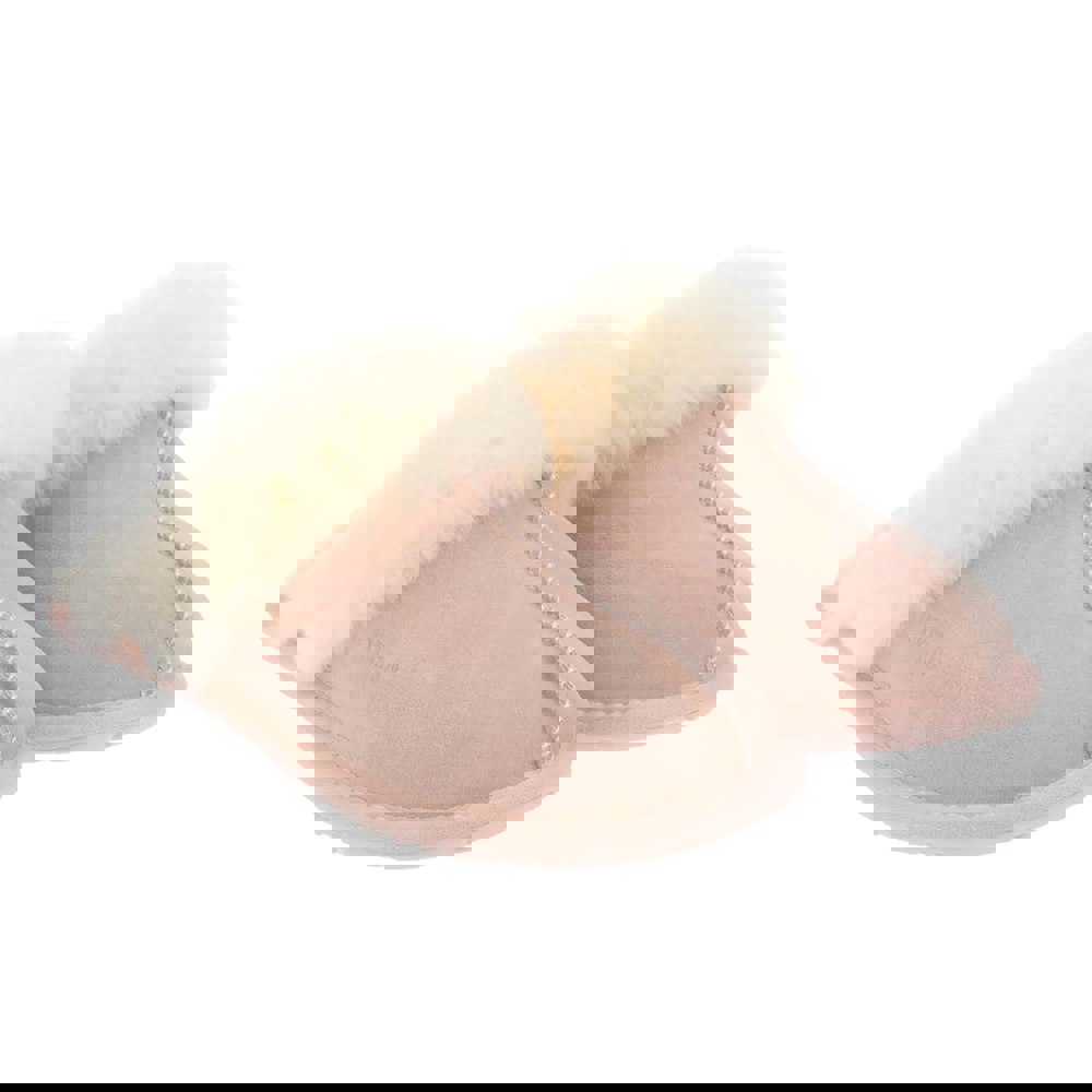 These women’s slippers are made with a cow suede leather upper in pink, finished with a plain design and a round toe. A slip-on fastening keeps the profile clean and easy to wear, suited to everyday use around the home.