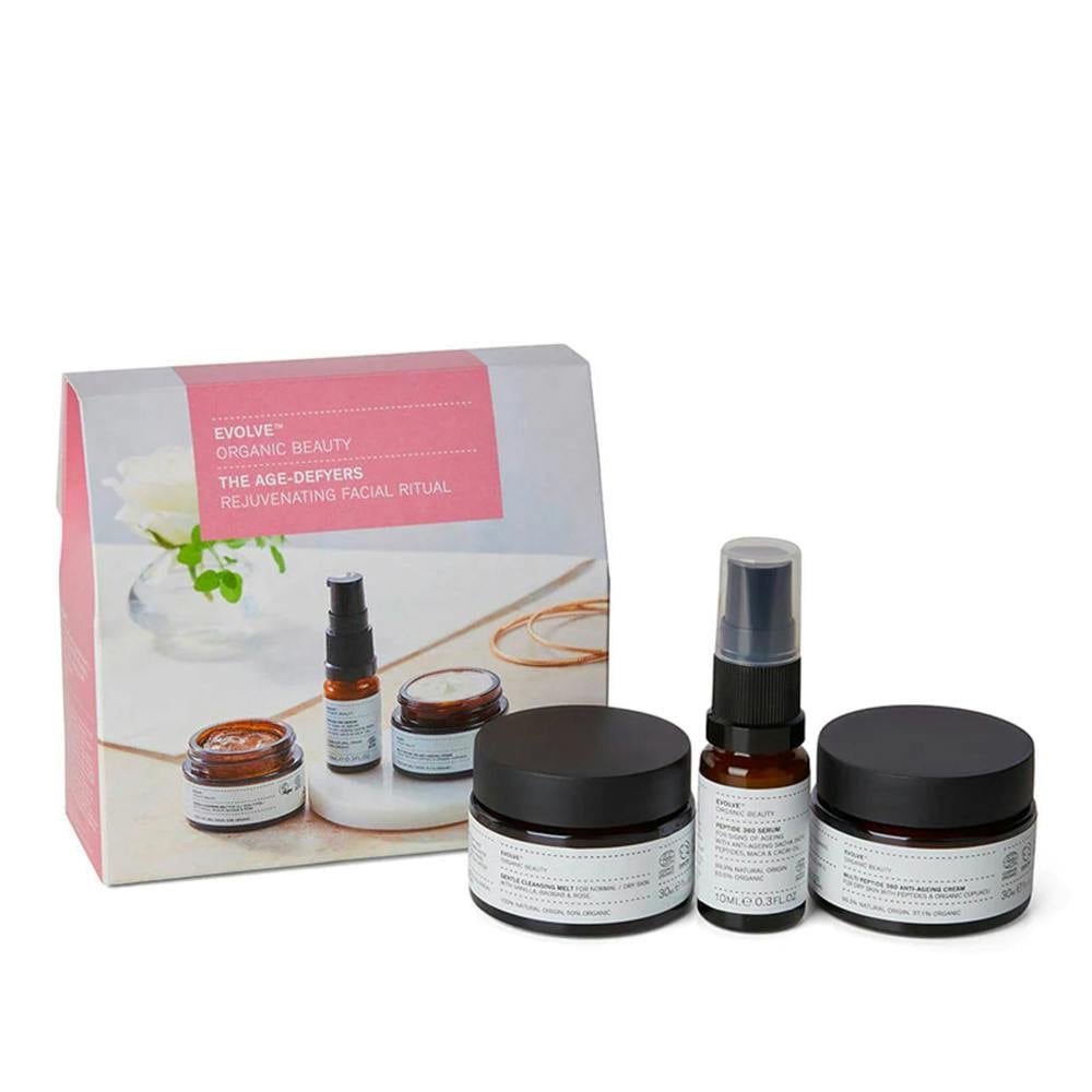 Evolve Organic Beauty The Age Defyers helps your skin achieve smoothness, plumpness and a more youthful -look. With three travel-sized smart-ageing skincare treats, this daily skincare gift will ensure your skin is cleansed, nourished, and visibly rejuvenated.