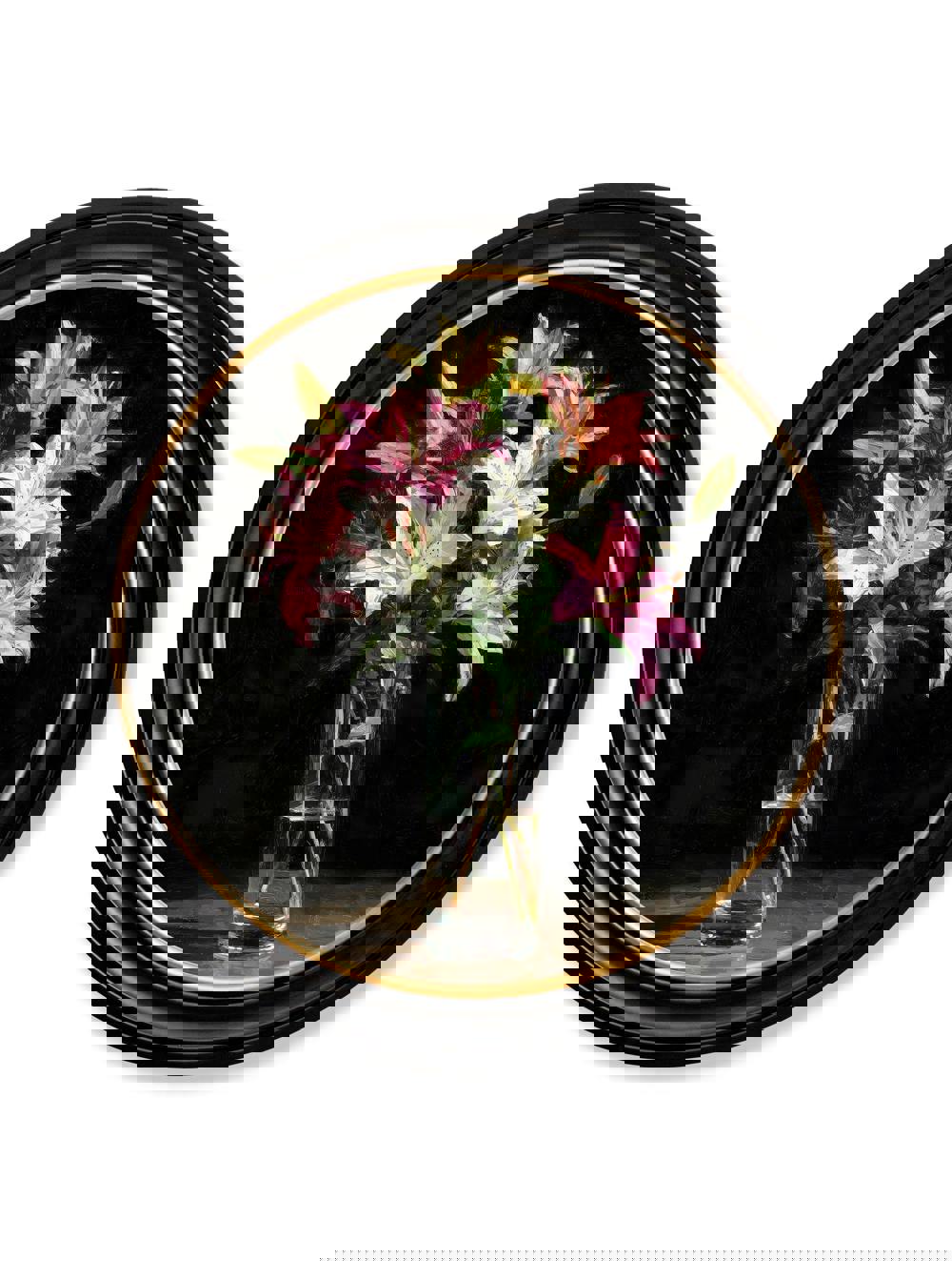 This elegant print from our After Dark collection features a graceful bouquet of lilies in soft pinks, creamy whites and deep wine tones, arranged in a simple glass vase against a rich black background. Sweeping petals and delicate speckled details are brought to life through expressive palette-knife textures and confident brushwork, giving the flowers a sense of movement and quiet drama. Finished in our signature round Oxford Black and Gold frame, this print pairs effortlessly with the other After Dark series for a cohesive wall display full of richness, texture and timeless floral drama.