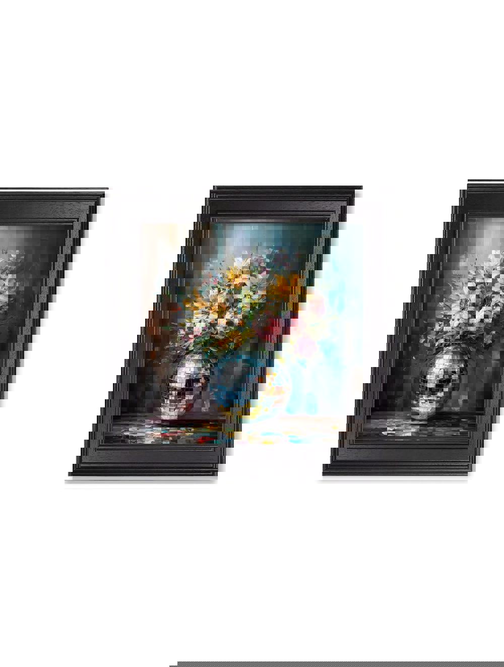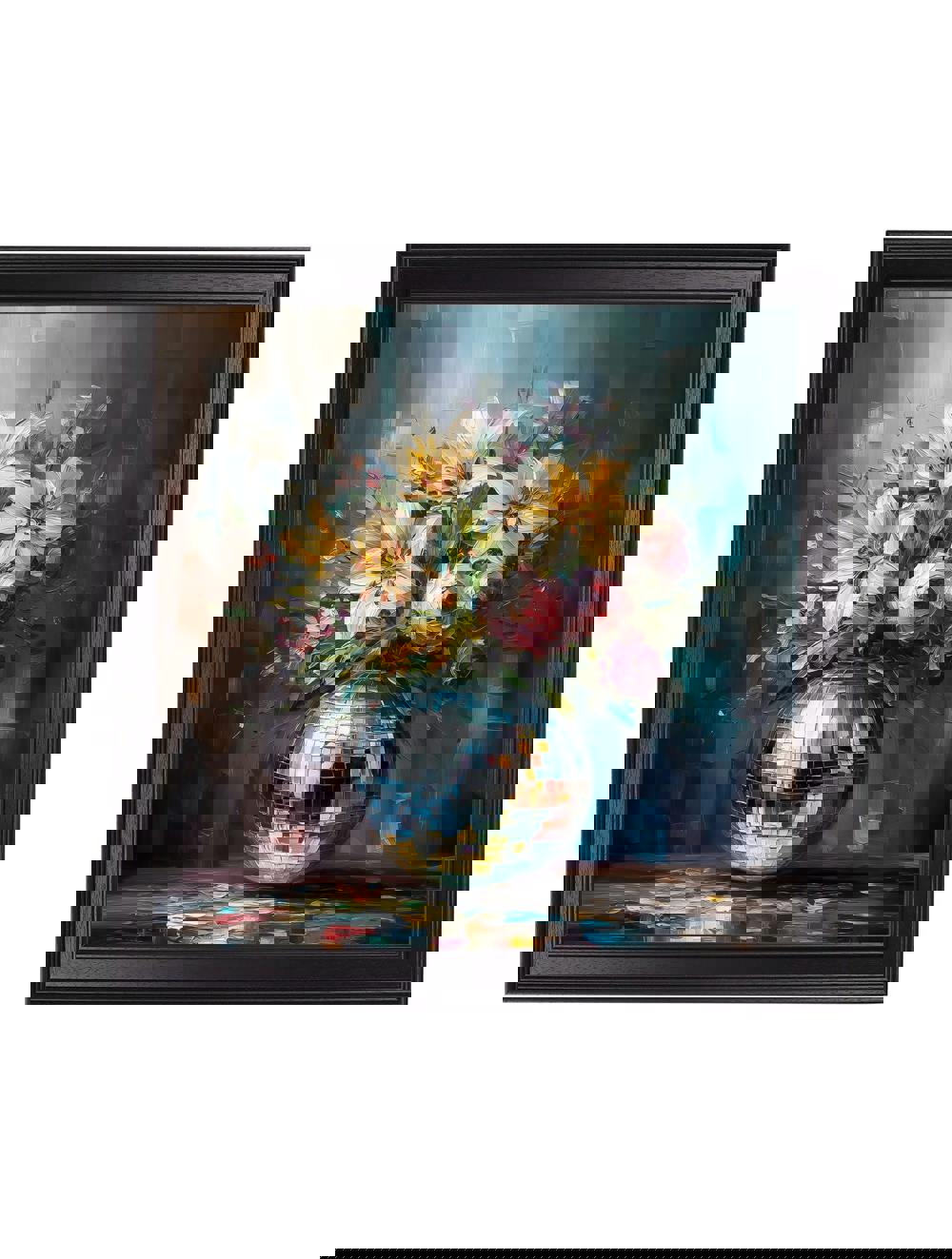 This playful print features a vibrant lily & rose bouquet bursting from a shimmering mirrored disco-ball, blending floral elegance with a joyful, modern twist. Expressive palette-knife textures and brushstrokes bring each petal to life, while the mosaic reflections of the disco-ball vase add movement, light and a subtle touch of glamour. The moody blues in the background balance the soft pinks, whites and sunny yellows of the flowers, creating a fresh yet cosy focal point for any space. Finished in our square Black Hurstwood frame, this print pairs beautifully with our Disco Bloom collection, adding colour, texture and a hint of sparkle to any room.