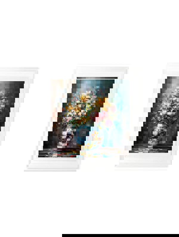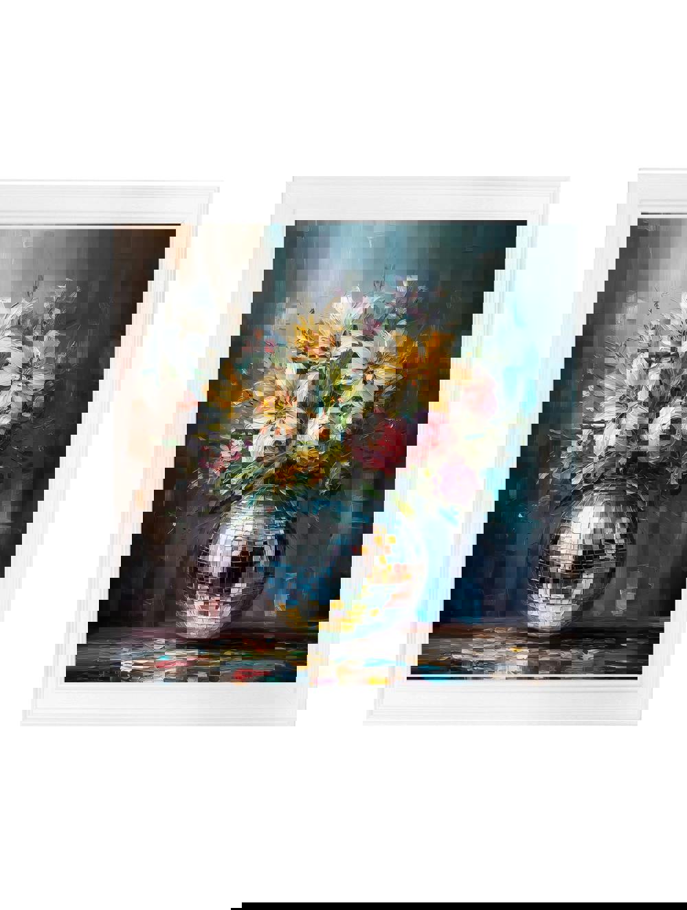 This playful print features a vibrant lily & rose bouquet bursting from a shimmering mirrored disco-ball, blending floral elegance with a joyful, modern twist. Expressive palette-knife textures and brushstrokes bring each petal to life, while the mosaic reflections of the disco-ball vase add movement, light and a subtle touch of glamour. The moody blues in the background balance the soft pinks, whites and sunny yellows of the flowers, creating a fresh yet cosy focal point for any space. Finished in our square Strong White Hurstwood frame, this print pairs beautifully with our Disco Bloom collection, adding colour, texture and a hint of sparkle to any room.